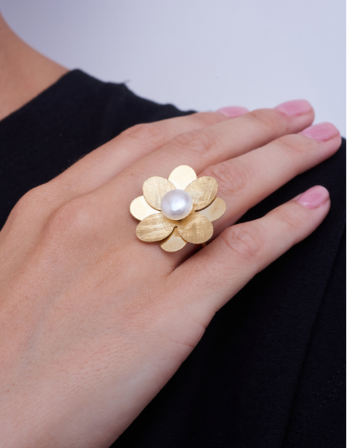 Δαχτυλίδι σε κίτρινο χρυσό 18 καρατίων (18Κ) επιμετάλλωση με σχέδιο ανθισμένου λουλουδιού. Η πρώτη σειρά πετάλων είναι σε επεξεργασία mat brush, ενώ η δεύτερη είναι με γυαλιστερό φινίρισμα. Το κέντρο του λουλουδιού αποτελεί ένα λαμπερό, λευκό μαργαριτάρι. Το δαχτυλίδι σε σχήμα λουλούδι είναι από την σειρά "Flower", VOGUE.