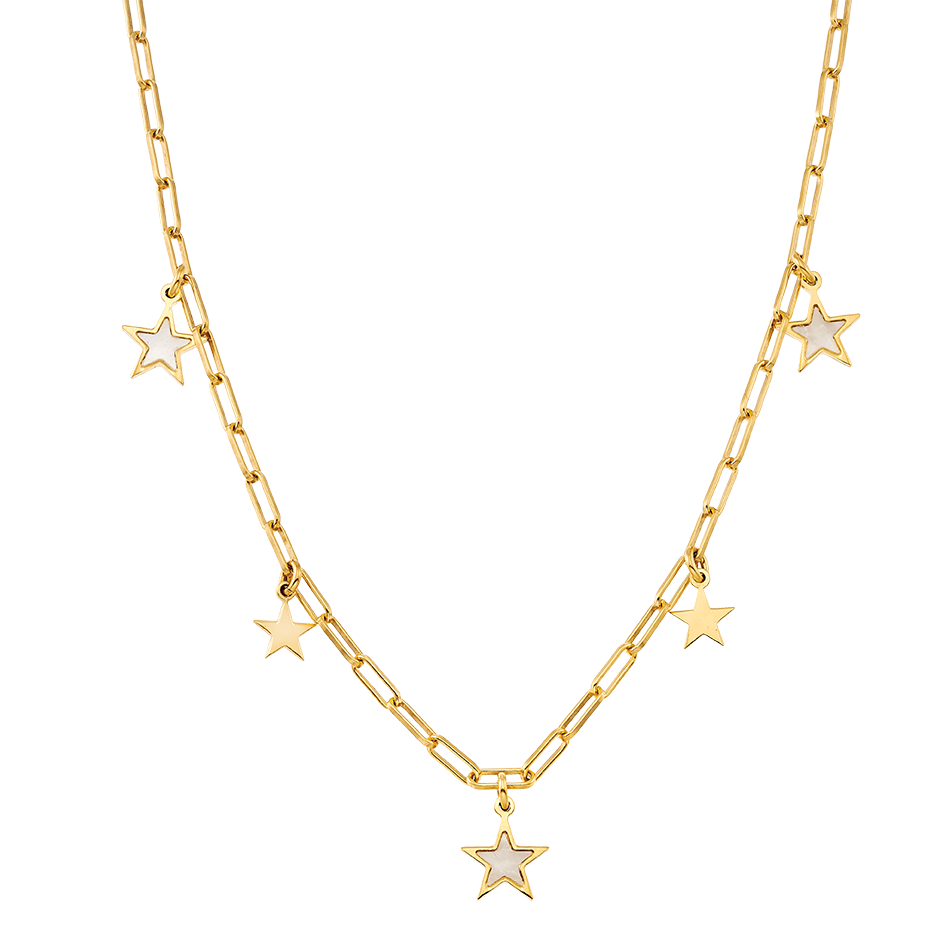 Κολιέ μεσαίου μήκους με μεγάλους κρίκους σε χρυσό 18 καρατίων (18Κ) επιμετάλλωση και 5 κρεμαστά παντατίφ σε σχήμα αστεριού από λευκό φίλντισι, από την σειρά "Moments", VOGUE.