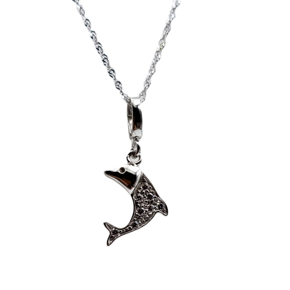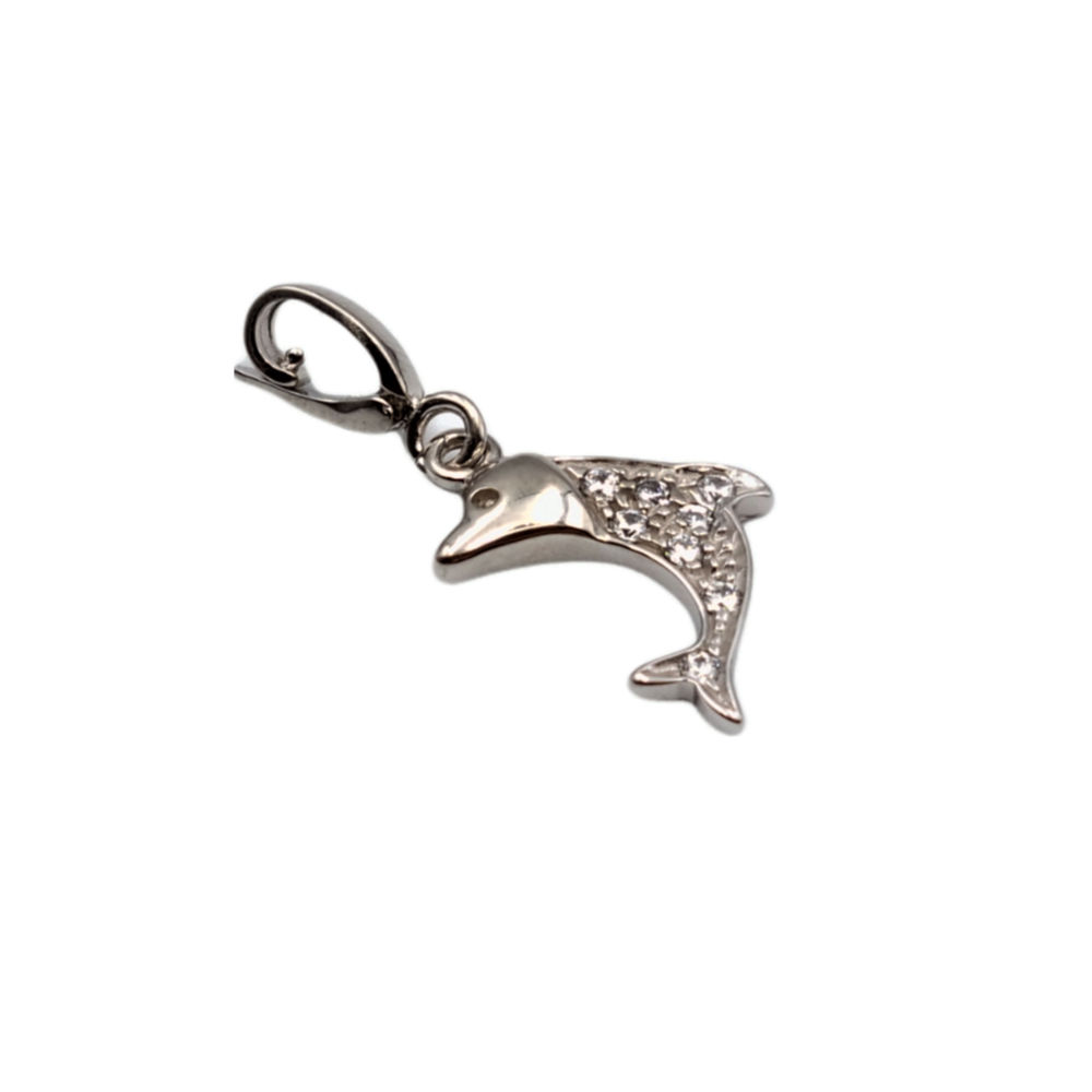 Δελφινάκι κρεμαστό από λευκόχρυσο Κ14 διακοσμημένο με πέτρες ζιργκόν λευκές.