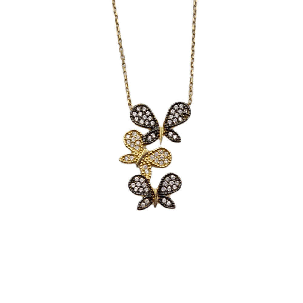 Γυναικείο κολιέ από χρυσό Κ14 με τρεις πεταλούδες διακοσμημένες με λευκές πέτρες ζιργκόν.