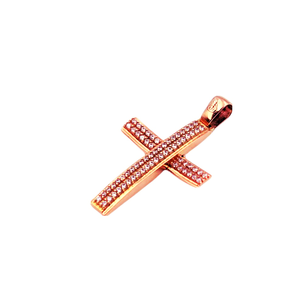 Σταυρός γυναικείος από ροζ χρυσό Κ14 διακοσμημένος με πέτρες ζιργκόν λευκές.