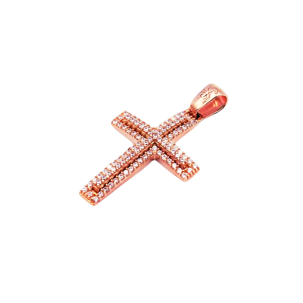 Σταυρός γυναικείος από ροζ χρυσό Κ14 διακοσμημένος με πέτρες ζιργκόν λευκές.