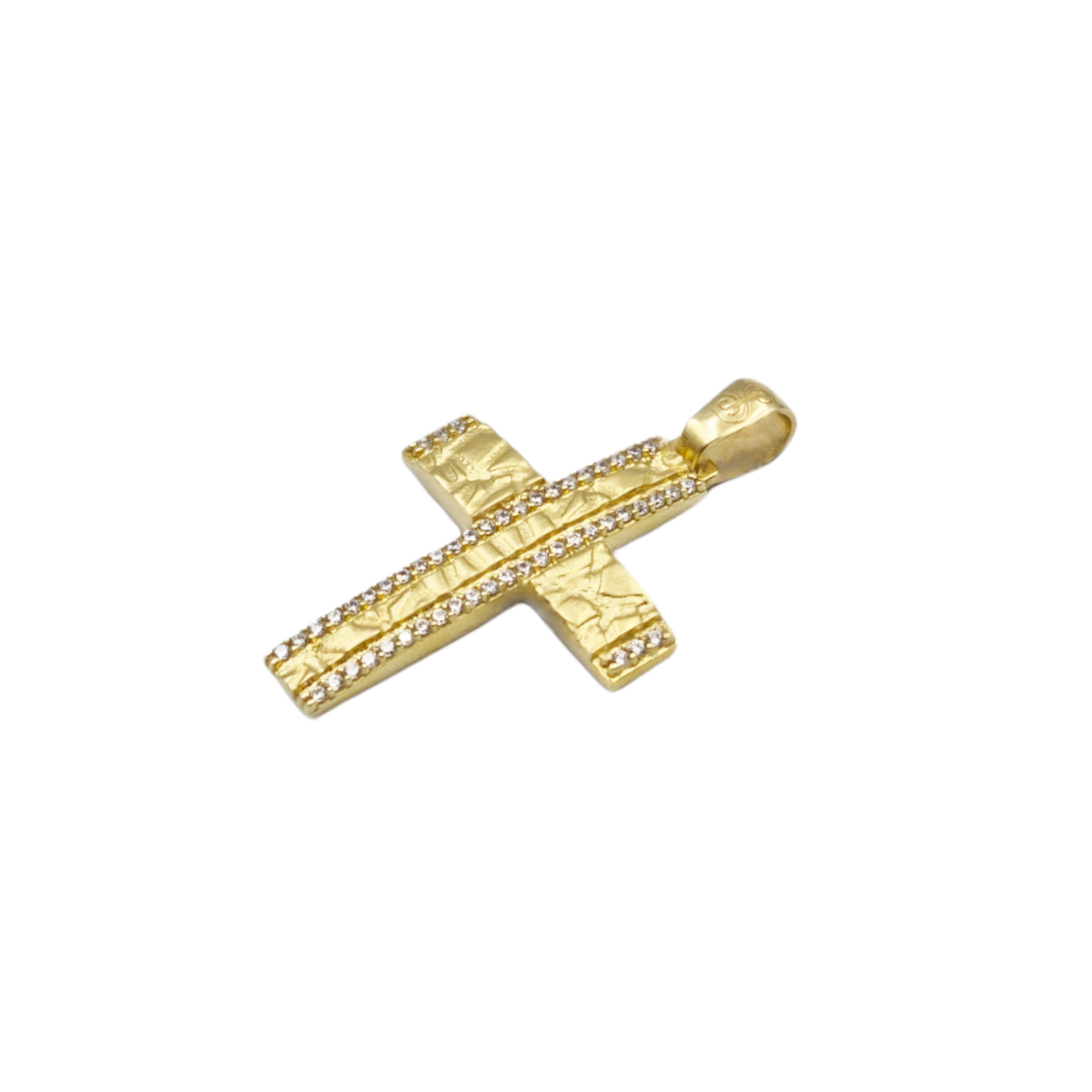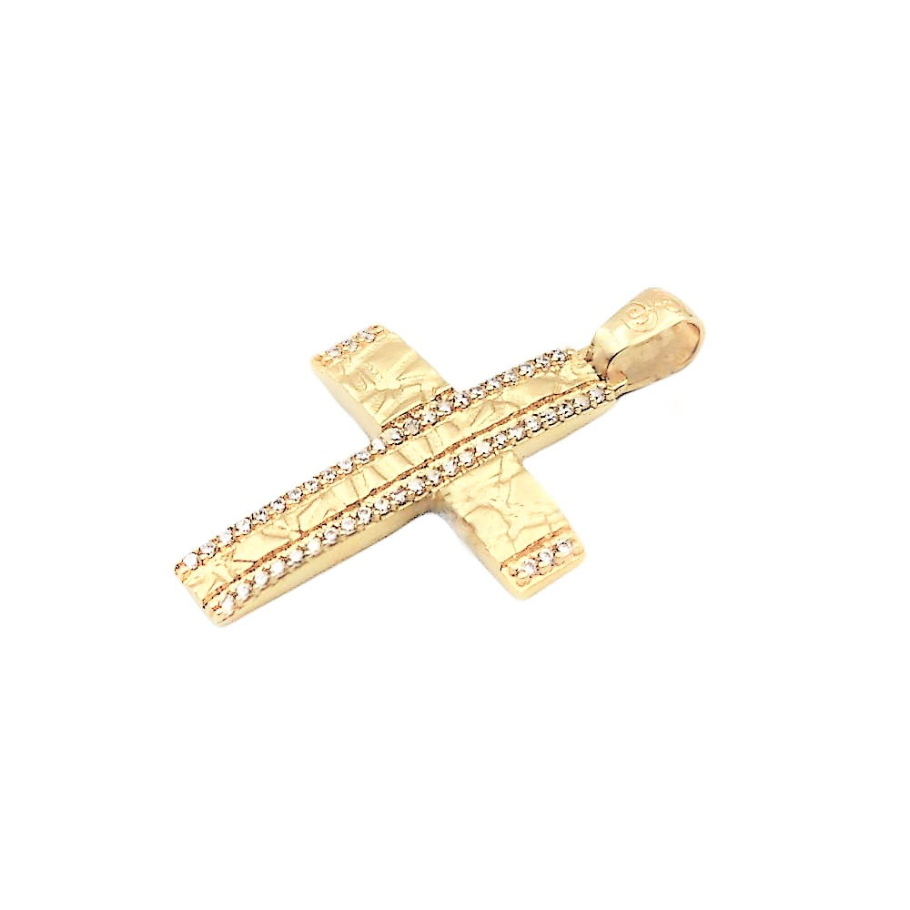 Σταυρός γυναικείος από χρυσό Κ14 σε σαγρέ υφή, διακοσμημένος με πέτρες λευκές.