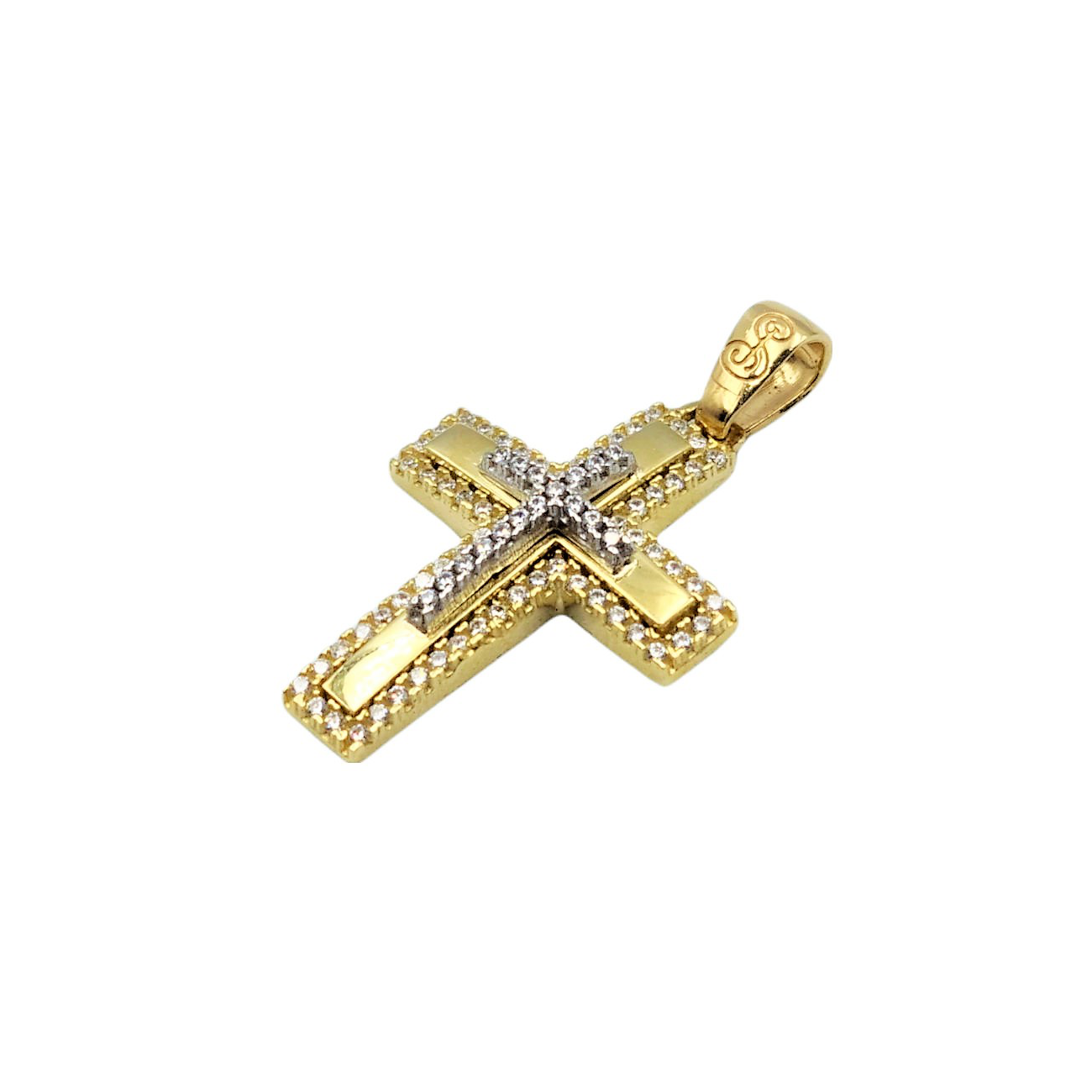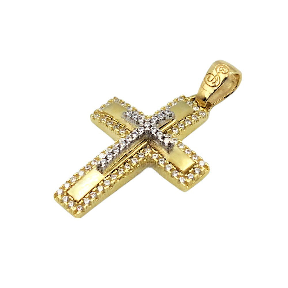 Σταυρός γυναικείος δίχρωμος από χρυσό Κ14, πομπέ σε λεία υφή διακοσμημένος περιμετρικά και στο κέντρο με λευκές πέτρες ζιργκόν.