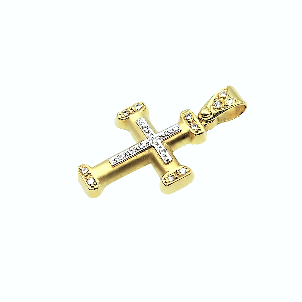 Σταυρός δίχρωμος από χρυσό Κ14 σε αμμοβολή, διακοσμημένος με πέτρες ζιργκόν λευκές.