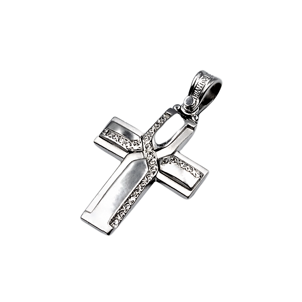 Σταυρός γυναικείος από λευκό χρυσό Κ14 της εταιρείας Triantos σε ματ και λεία υφή, διακοσμημένος με λευκές πέτρες ζιργκόν.
