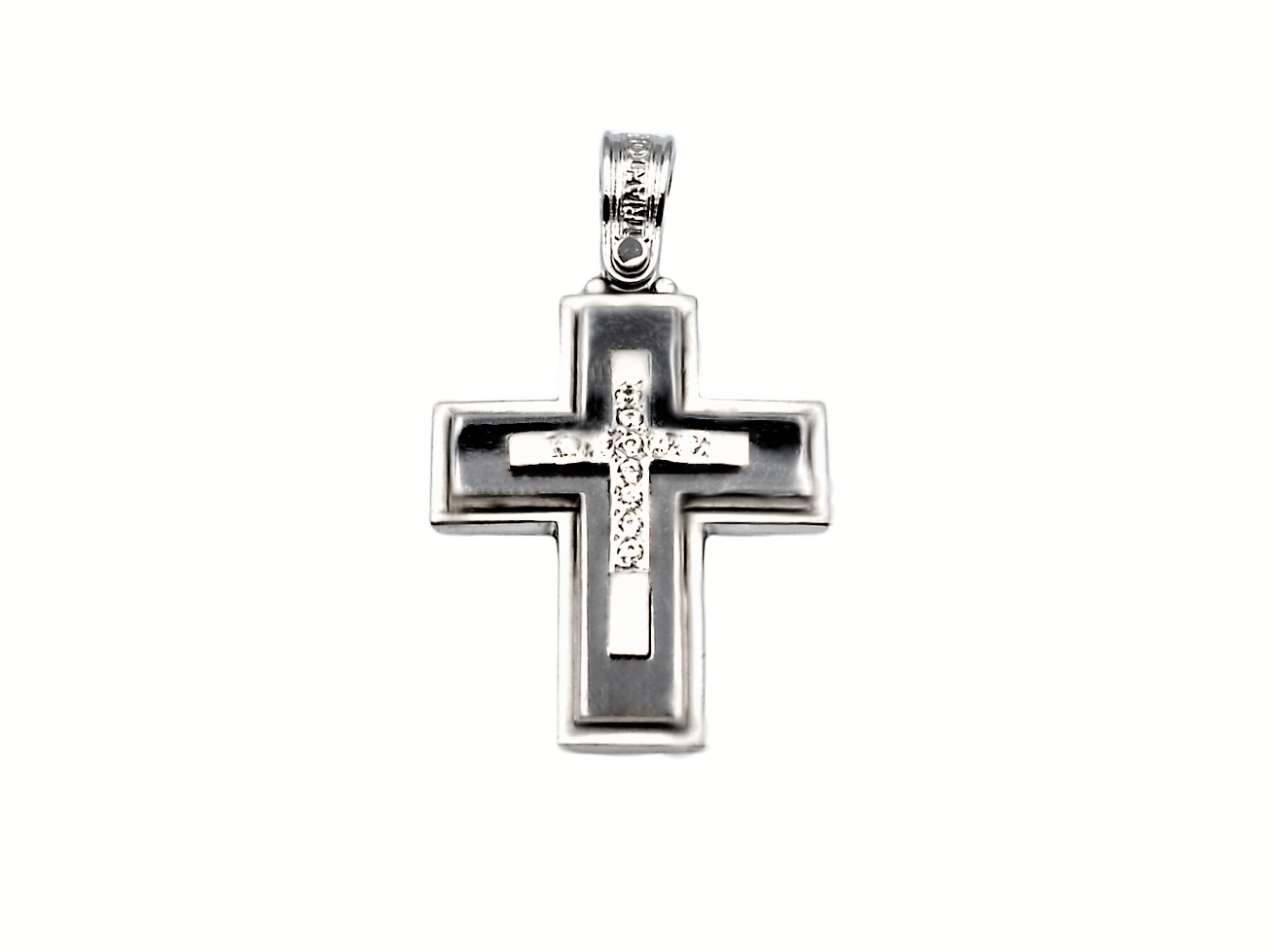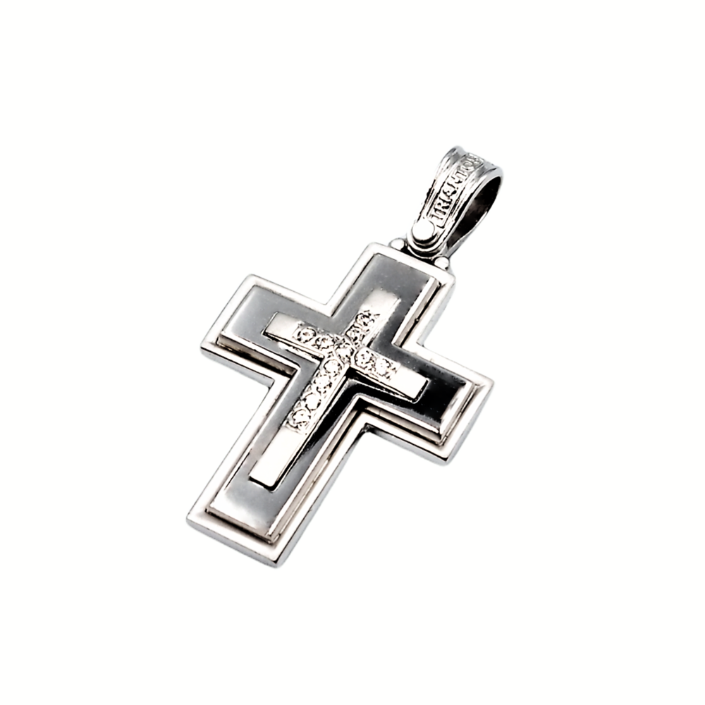 Σταυρός γυναικείος από λευκό χρυσό κ 14 μασίφ με λουστρέ- ματ φινίρισμα και λευκά ζιργκόν