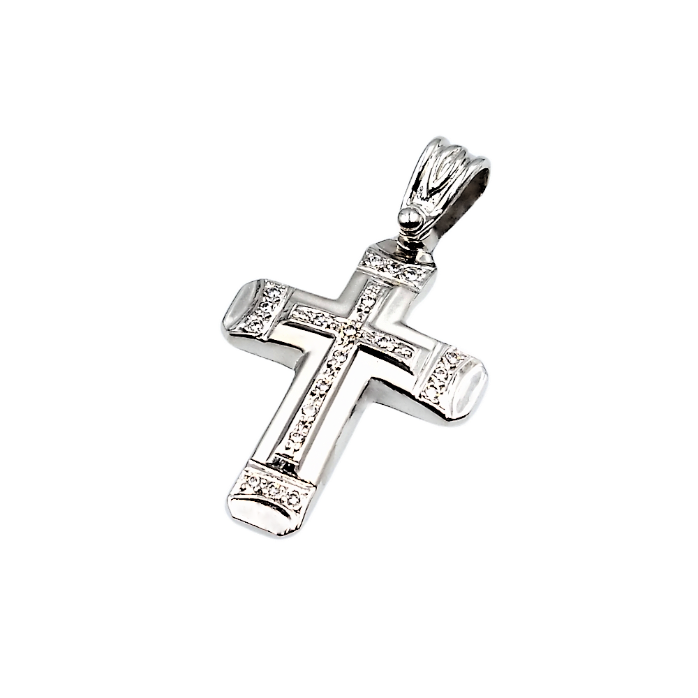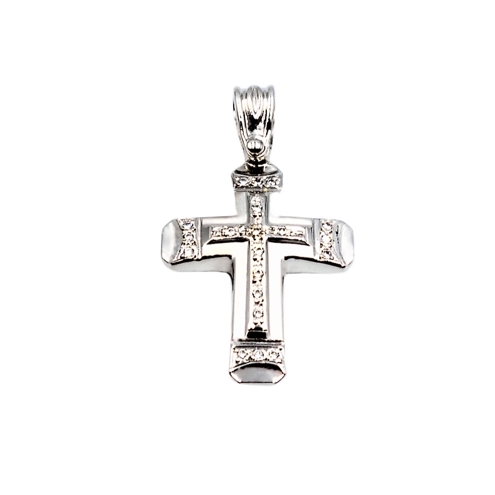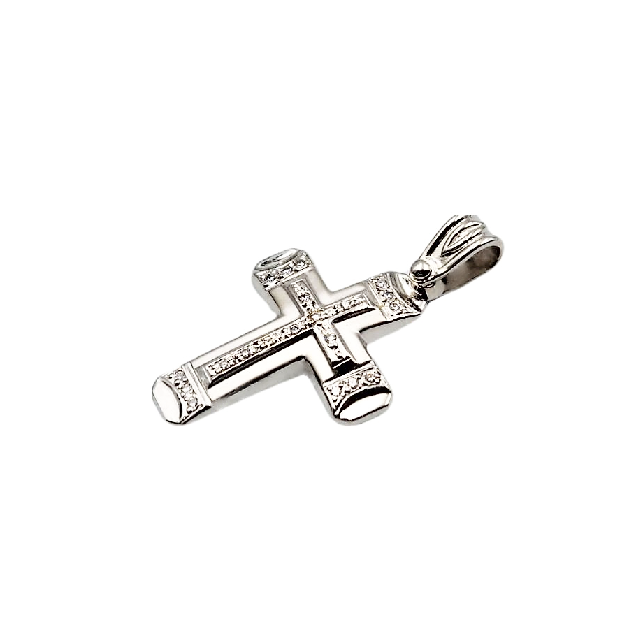 Σταυρός γυναικείος από λευκό χρυσό κ14 με αμμοβολή και πέτρες ζιργκόν