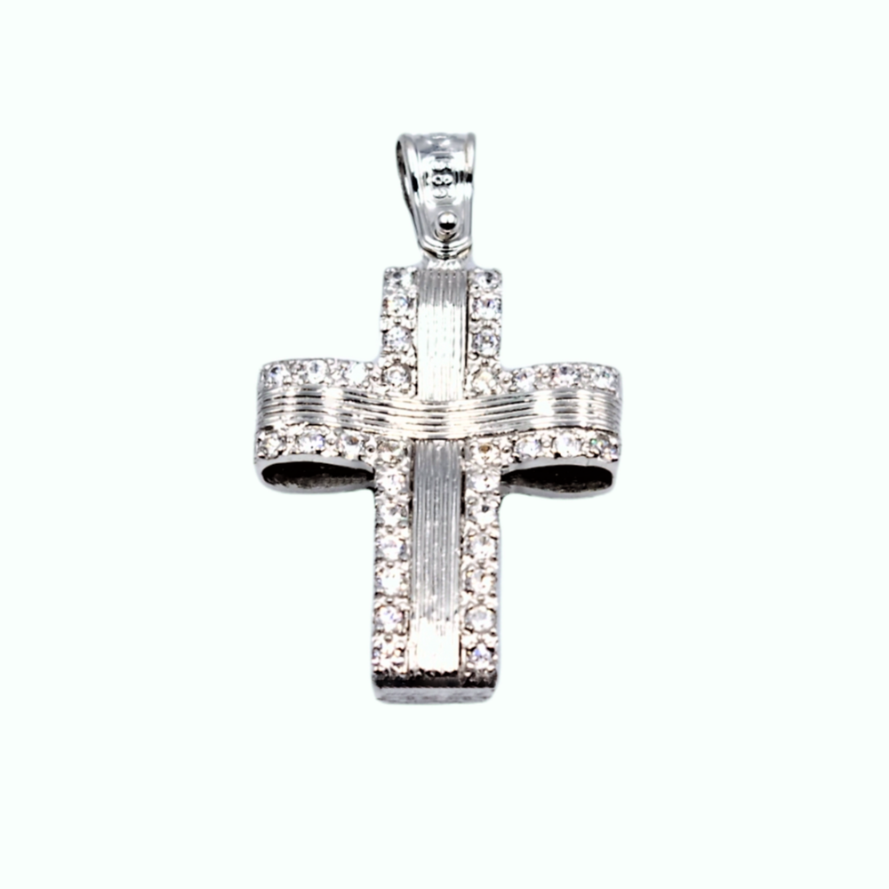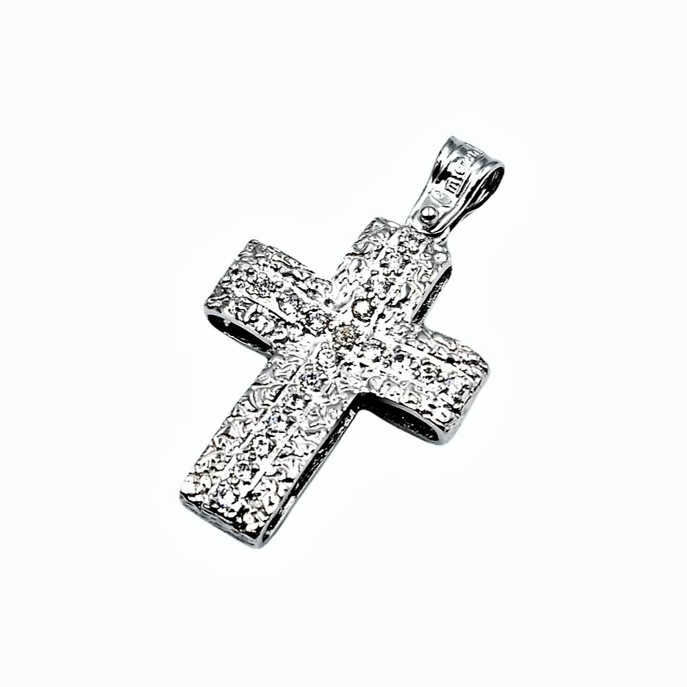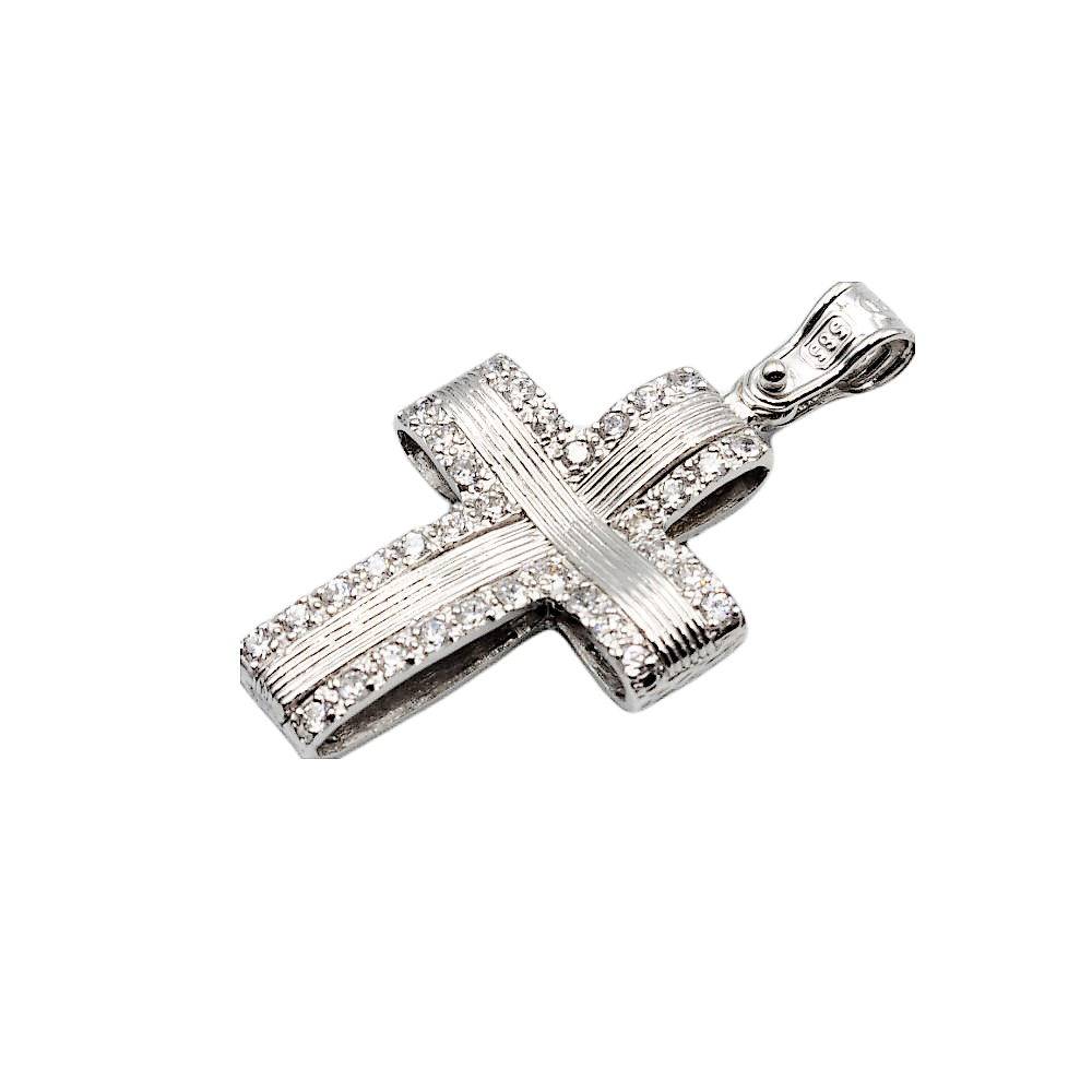 Σταυρός γυναικείος χειροποίητος από λευκό χρυσό κ14 διπλής όψης με λευκά ζιργκόν